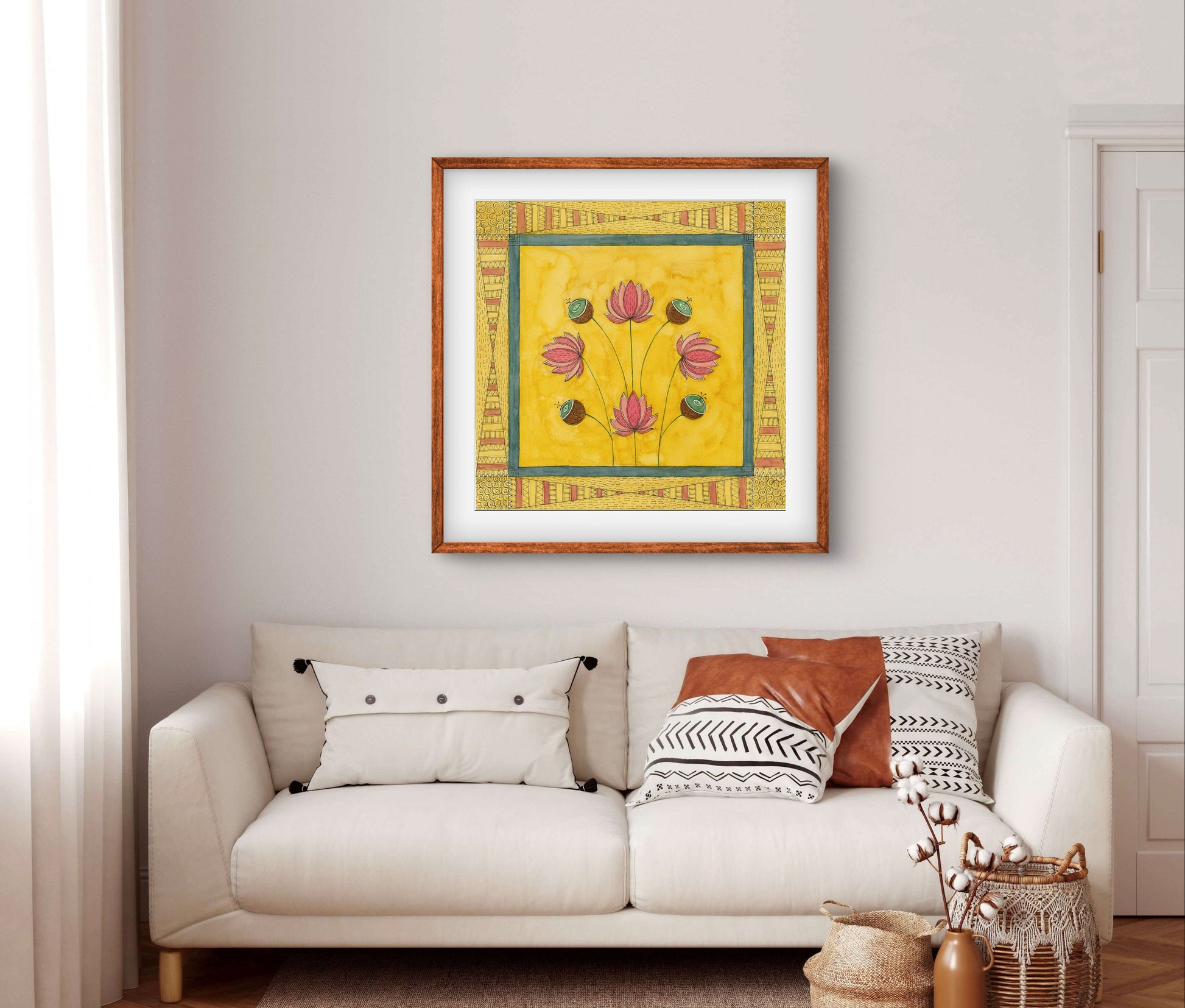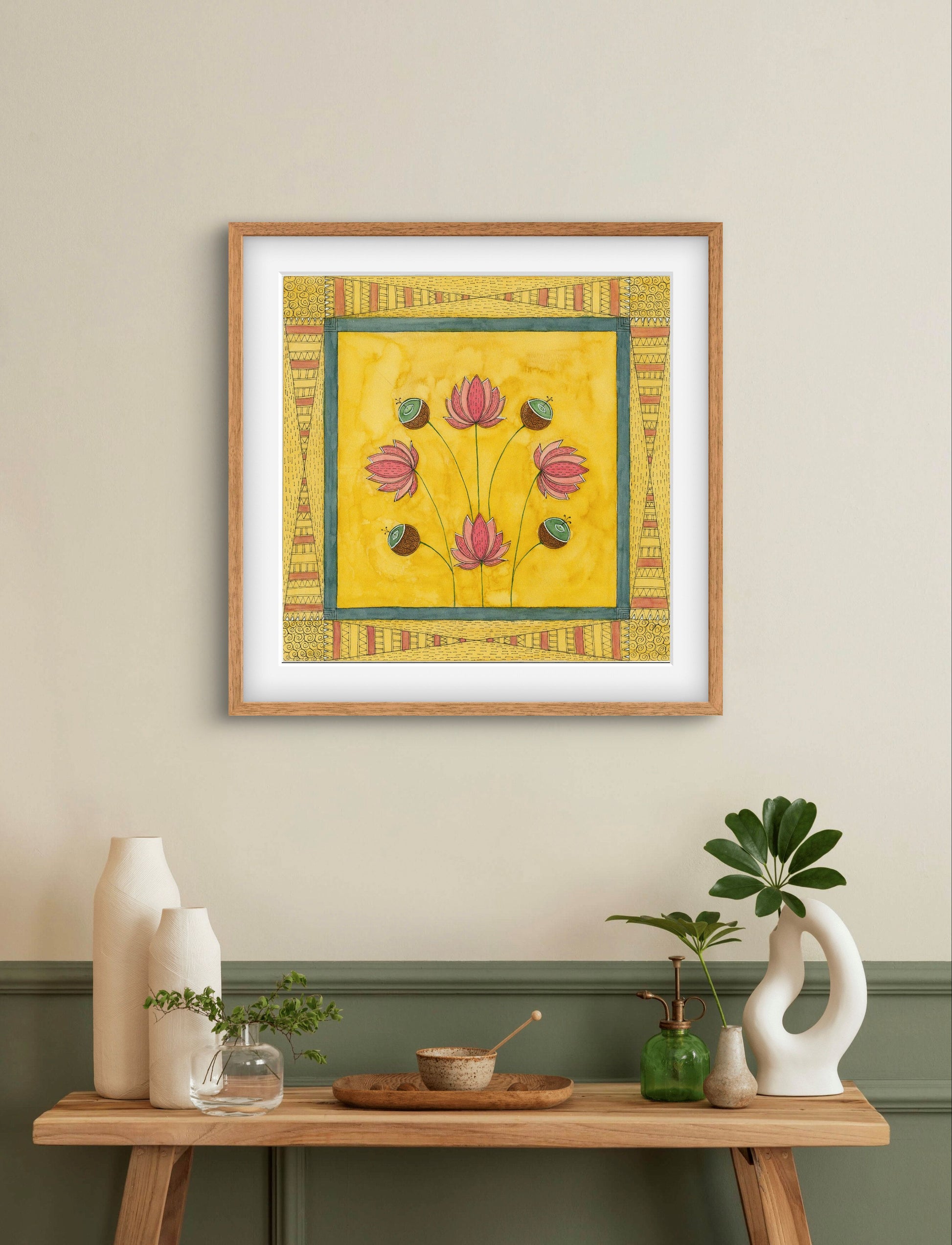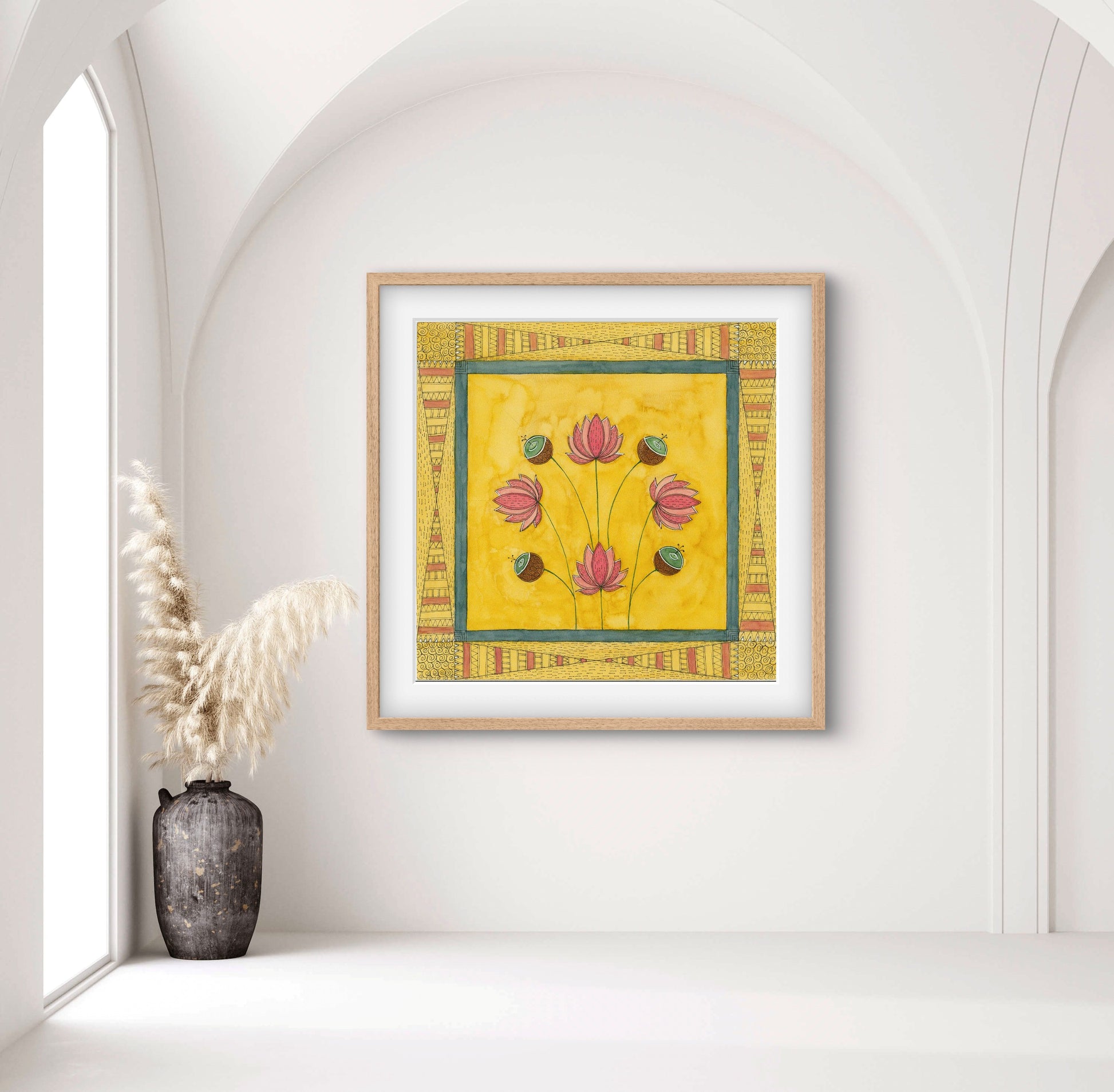 "Vintage Madhubani motif artwork featuring traditional Indian folk patterns. High-quality fine art print with intricate details. Authentic cultural art for home decor."