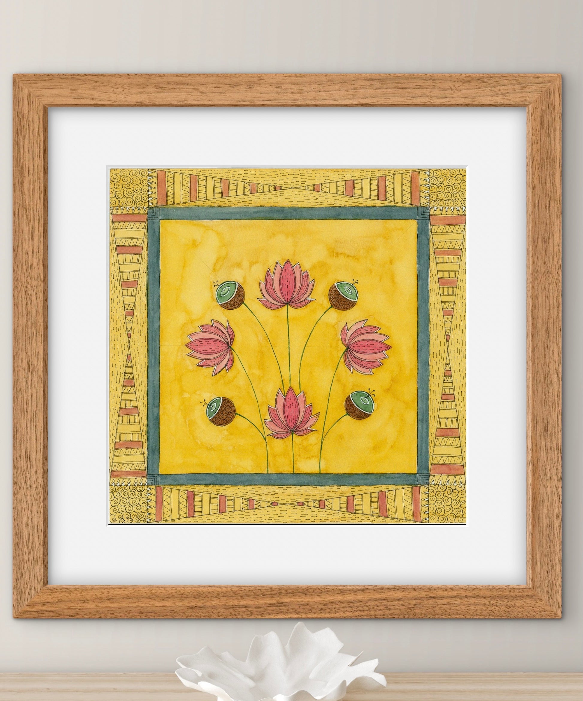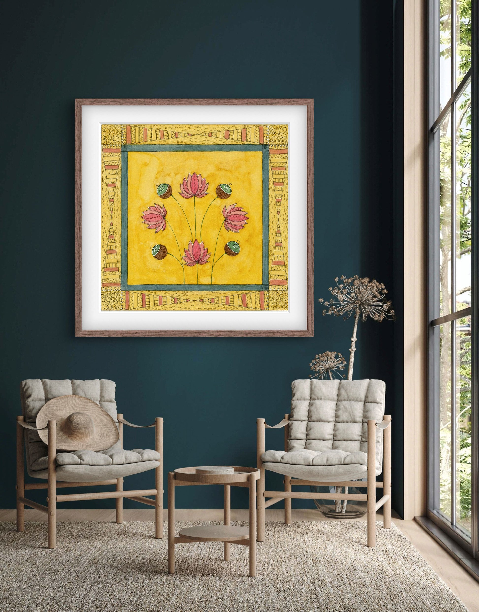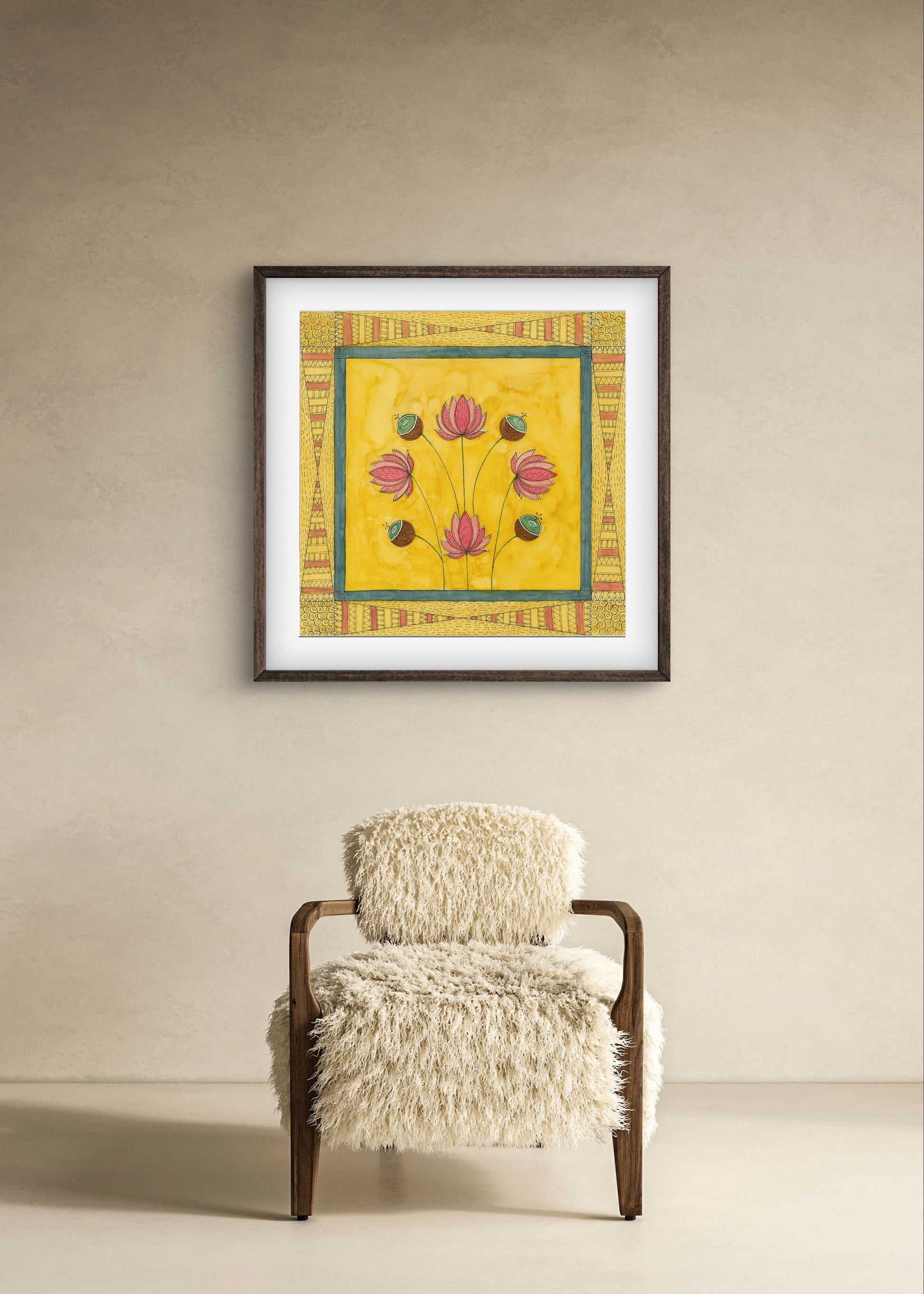"Vintage Madhubani motif artwork featuring traditional Indian folk patterns. High-quality fine art print with intricate details. Authentic cultural art for home decor."